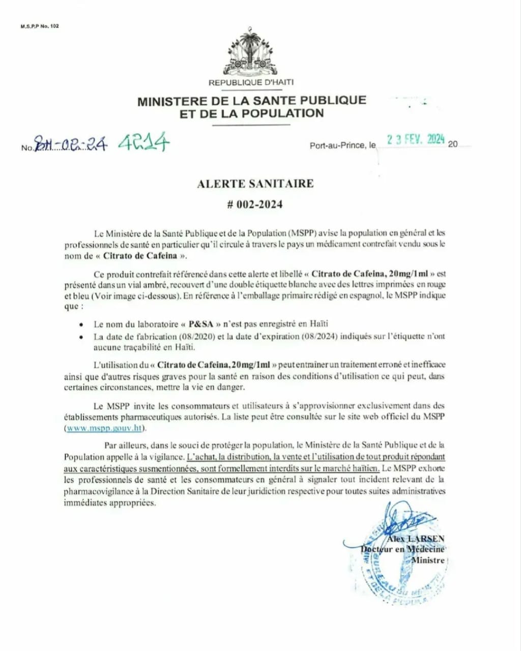 Le Ministère de la Santé Publique et de la Population (MSPP) avise la population en général et les professionnels de santé particuliers qu’il circule à travers le pays un médicament contrefait vendu sous le nom de « Citato de Cafeina ».